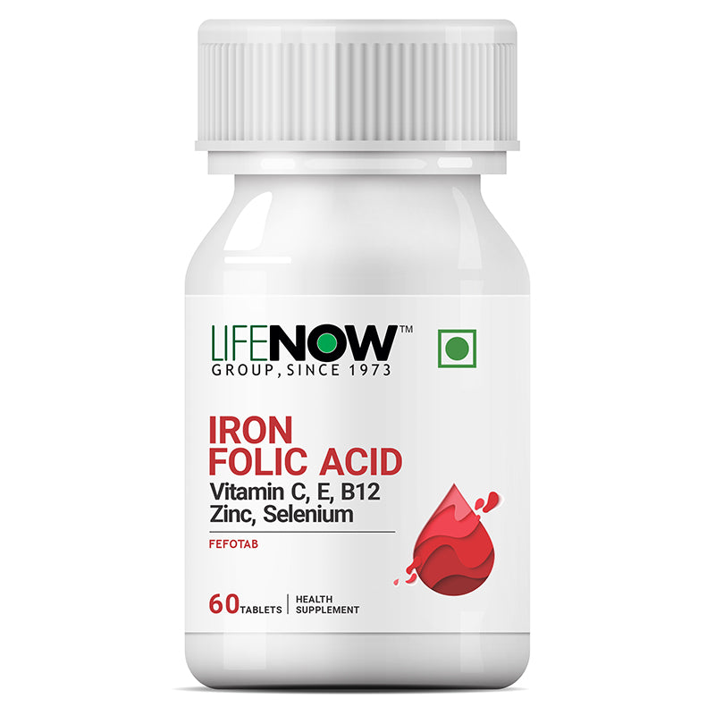 LIFENOW Chelated Iron Folic Acid Supplement with Vitamin C, E, B12, Zinc, Selenium- 60 Tablets
