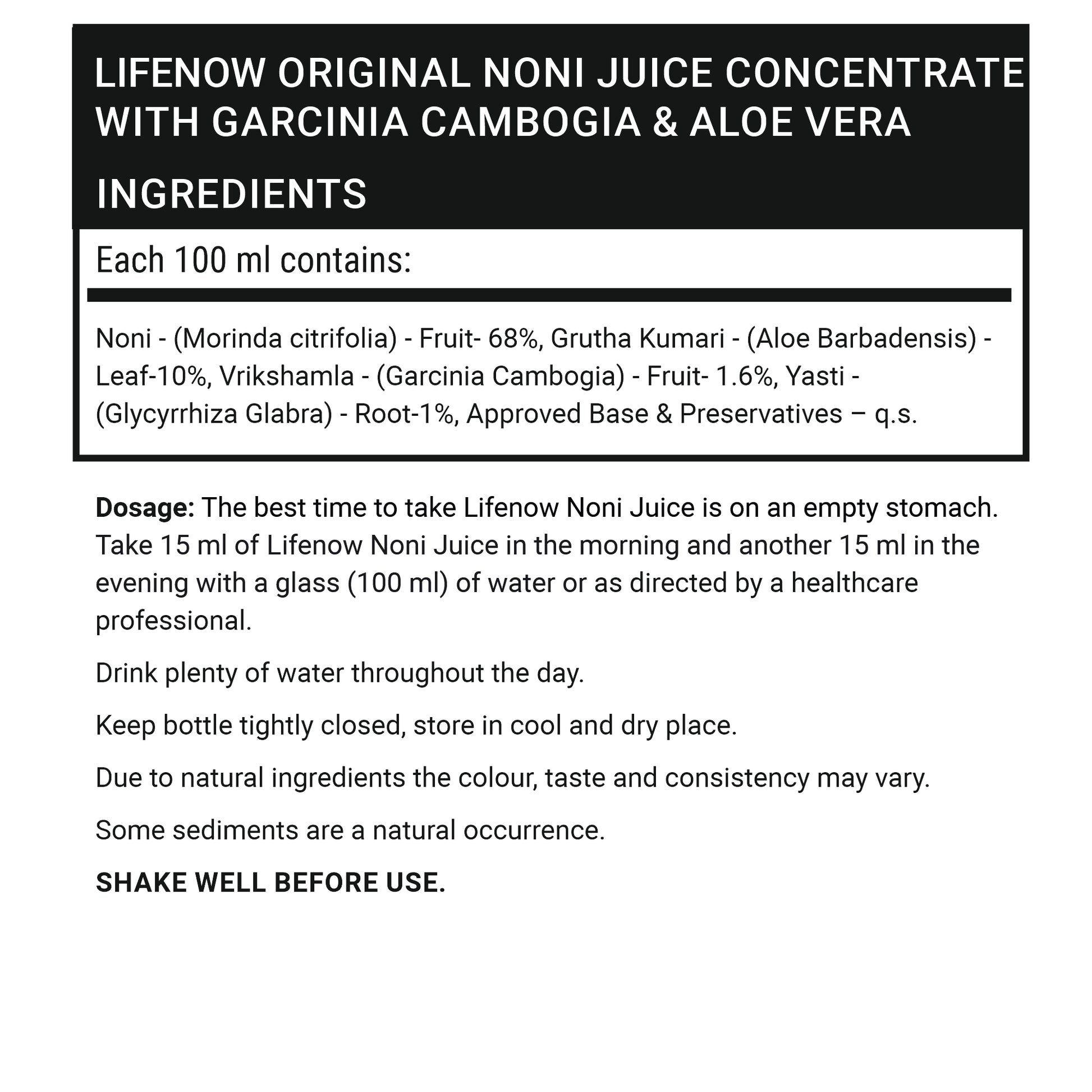 Suggested usage - The best time to take Lifenow Noni Juice Concentrate is on an empty stomach. Take 15ml of Lifenow Noni Juice in the morning and another 15ml in the evening with a glass (100ml) of water or as directed by your healthcare professional.